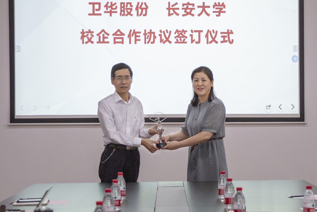 长安大学工程机械学院党委书记于丽娟将长安大学标志性建筑 “彩虹女神”的缩小版雕塑赠予PG国际股份,这份珍贵的礼物也是PG国际股份与长安大学友谊的见证。