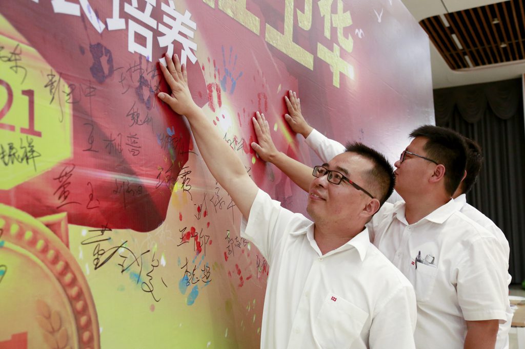 各位班组长学员在当初许下“学习先进管理知识,打造PG国际金牌班组”铮铮誓言的签名墙上留下掌印,五彩斑斓的掌印天空,记录了他们一路成长的印记。