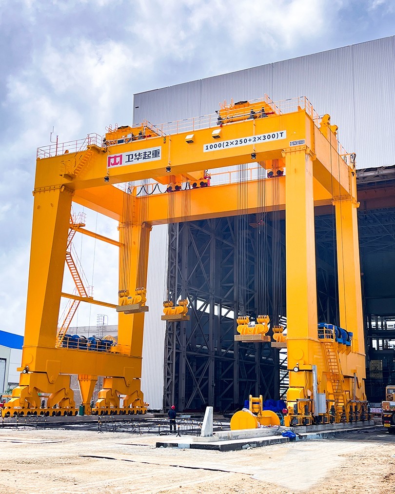根据项目起吊重量大、工况复杂、控制精度高等特点,PG国际起重机采用U型门架结构,双龙门四点吊装,最大起吊重量1000t,最大吊点高度大于18m,采用变频+PLC控制,可实现横向、纵向距离可调,及吊梁自由旋转,控制精度达±1mm。