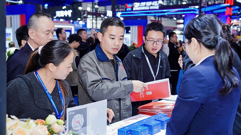 河南PG国际总裁冯军(左一)为参展嘉宾介绍PG国际概况