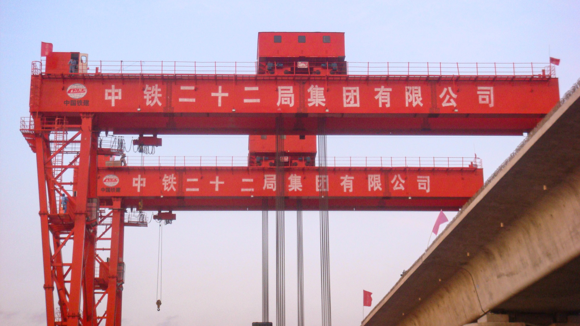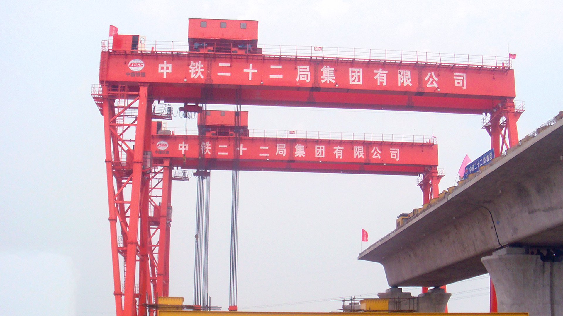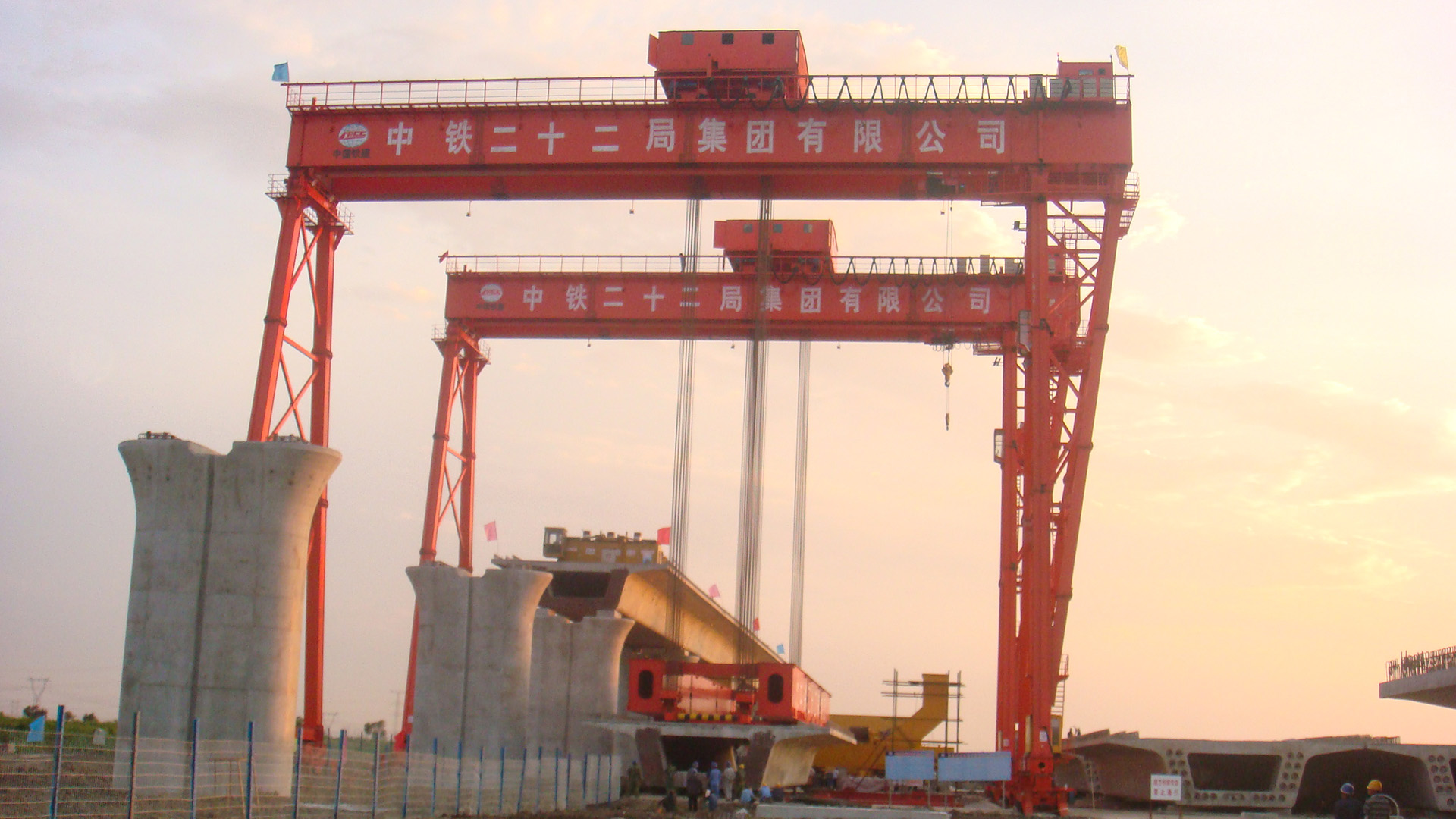 提梁机是一种为桥梁建设而专门设计的一种门式起重机。提梁机既可两台配合抬吊预制梁,也可以单台起重机配双吊具起吊预制梁,两台同时起重的提梁机各自的起重量一般为450吨,单台起重的提梁机起重量通常可达900吨。它配置支腿行走、天车行走及天车起吊设备,可以实现全方位机械化动作。主要用于将预制梁从制梁台提吊至存梁台位,预制梁养护完成后将其从存梁台位吊运到运梁车上。作为起重设备完成架桥机的组装和拆卸。还用于架设墩身不高的旱桥。