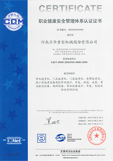 职业健康安全管理体系认证证书